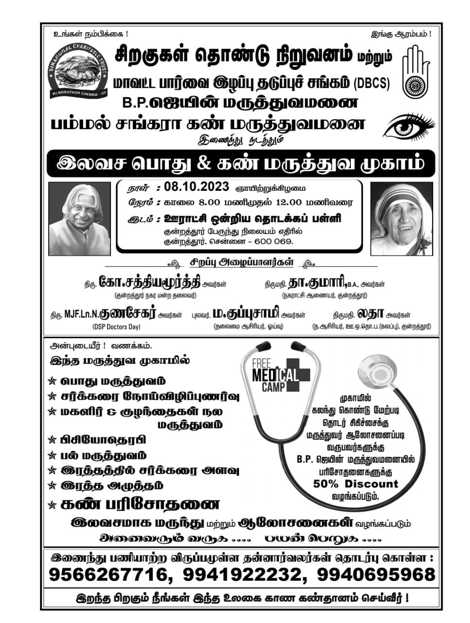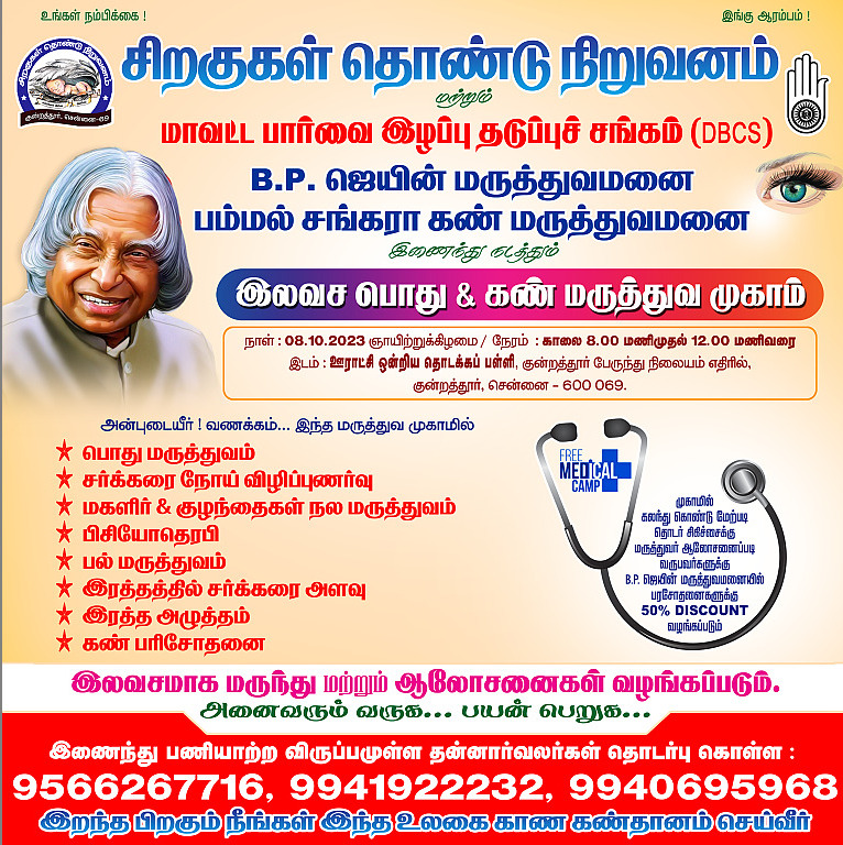 மறைந்த முன்னாள் இந்திய குடியரசுத் தலைவர் டாக்டர் A.P.J.அப்துல் கலாம் அவர்களின் பிறந்தநாளை முன்னிட்டு நமது சிறகுகள் தொண்டு நிறுவனம் மற்றும் B.P ஜெயின் மருத்துவமனை,பம்மல் சங்கரா கண் மருத்துவமனை இவர்களுடன் இணைந்து நடத்திய இலவச பொது மற்றும் கண் மருத்துவ முகாம் மிகச் சிறப்பான முறையில் நடைபெற்று முடிந்தது இதில் ஏராளமான பொதுமக்கள் கலந்துகொண்டு பயன் பெற்றனர் என்பதையும் மகிழ்ச்சியுடன் தெரிவித்துக் கொள்கிறோம். இந்த முகாமில் உறுப்பினர்களும் பொறுப்பாளர்களும் மிக சிறப்பாக முறையில் கலந்து கொண்டு செயல்பட்டனர் அவர்களுக்கு நமது சிறகுகள் தொண்டு நிறுவனத்தின் சார்பாக மனமார்ந்த நன்றிகளையும் வாழ்த்துகளையும் தெரிவித்துக் கொள்கிறோம். இதே போல் இனி வரும் காலங்களில் நடக்கும் நிகழ்விற்கும் அனைத்து உறுப்பினர்களும் பொறுப்பாளர்களும் சிறப்பான முறையில் நடத்தி தருமாறு தங்களை அன்போடு கேட்டுக்கொள்கிறோம்.