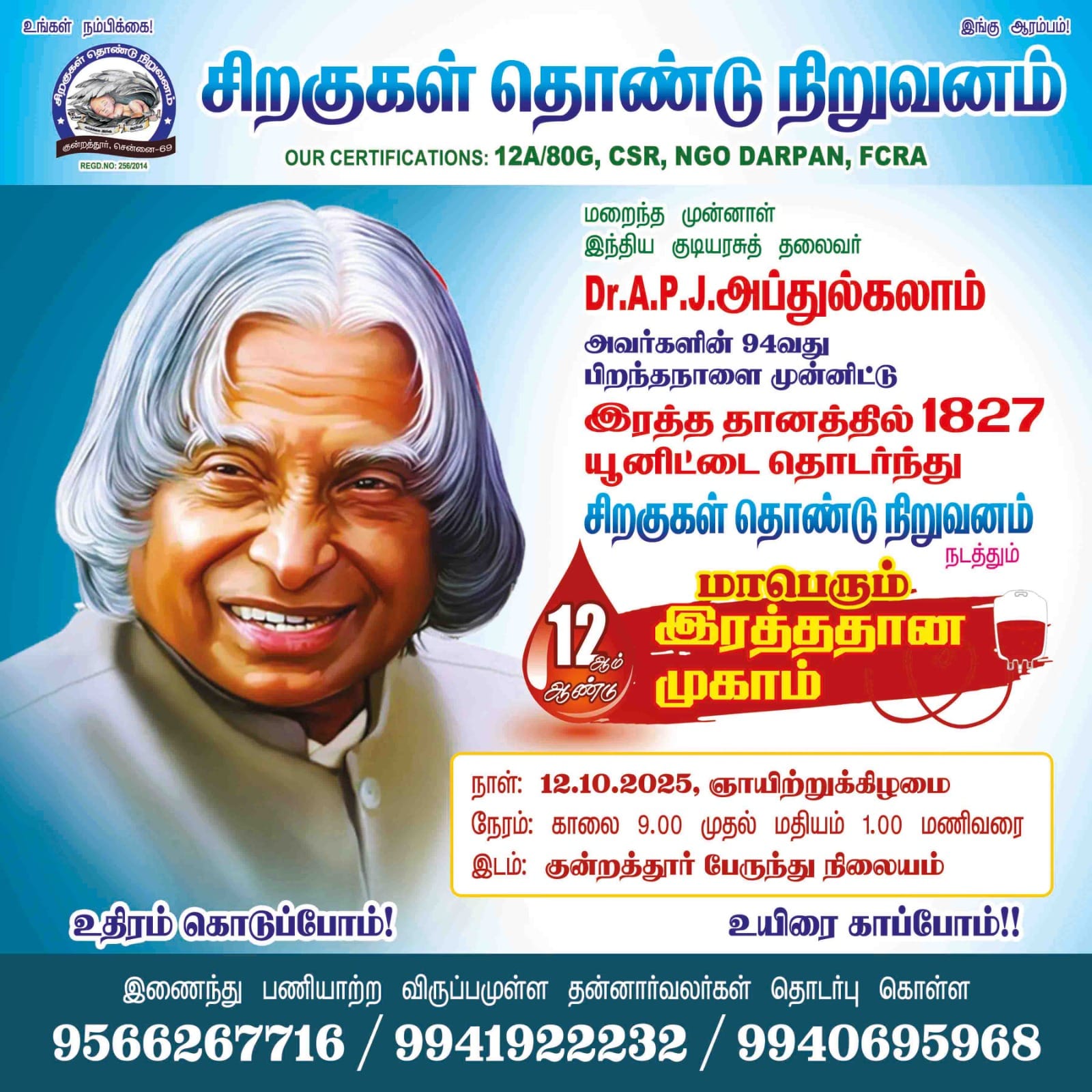 நமது சிறகுகள் தொண்டு நிறுவனம் கடந்த 10 ஆண்டுகளில் 🩸1600🩸 யூனிட் இரத்த தானத்தை தொடர்ந்து மறைந்த முன்னாள் இந்திய குடியரசுத் தலைவர் இளைஞர்களின் கனவு நாயகன் டாக்டர் A.P.J. அப்துல்கலாம் ஐயா அவர்களின் 93- வது பிறந்தநாளை முன்னிட்டு 11-ஆம் ஆண்டு இரத்ததான முகாம் நமது தொண்டு நிறுவனத்தின் செயற்குழு தலைவர் திரு.வெங்கடேசன் அவர்களின் தலைமையில் குன்றத்தூர் பேருந்து நிலையத்தில் மிகச் சிறப்பாக நடைபெற்று முடிந்தது. அவருக்கும், அவருடன் ஒருங்கிணைந்து செயல்பட்ட அனைத்து உறுப்பினர்களுக்கும், பொறுப்பாளர்களுக்கும் நமது சிறகுகள் தொண்டு நிறுவனத்தின் சார்பாக நன்றிகளையும் வாழ்த்துக்களையும் தெரிவித்துக் கொள்கிறோம்.